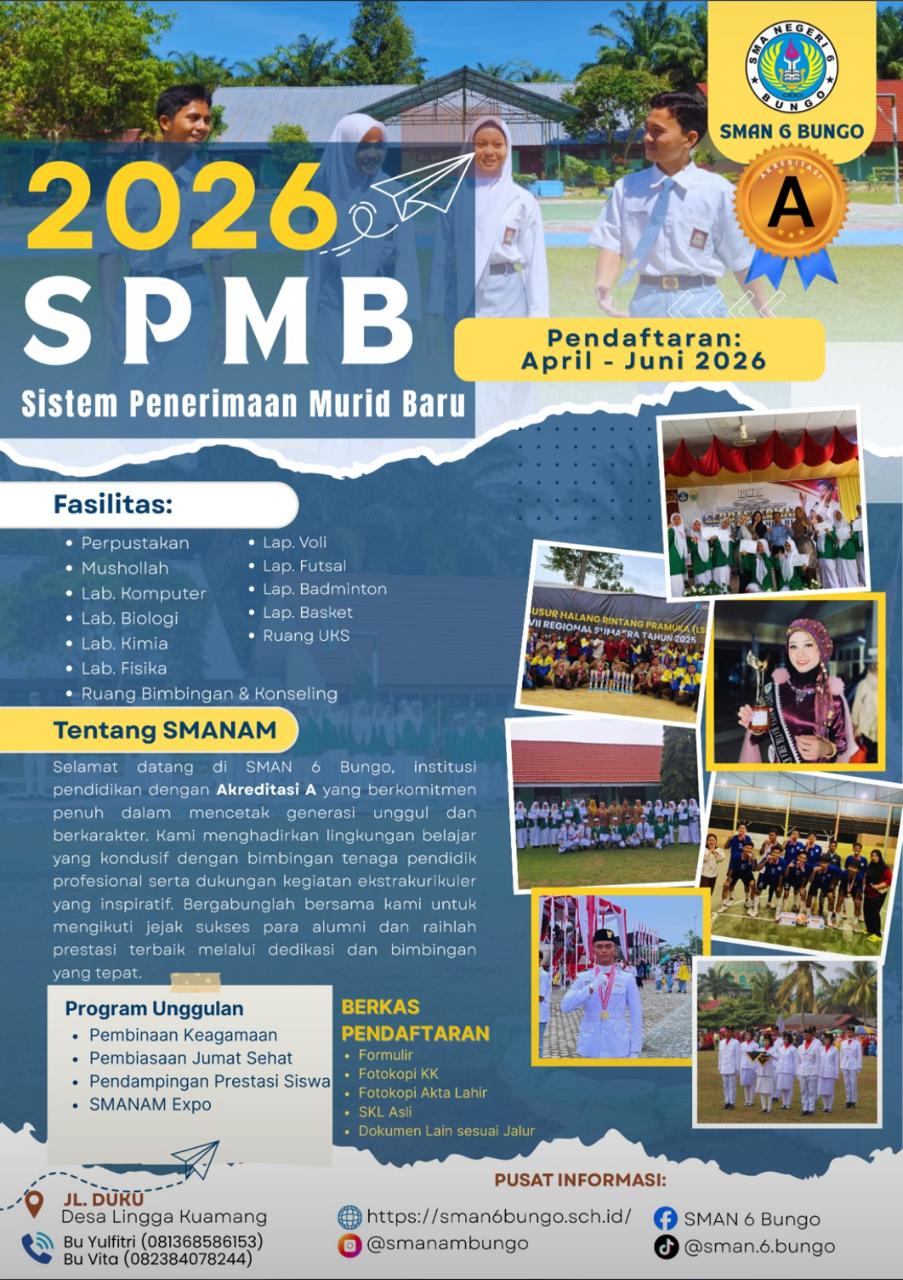 SMAN 6 Bungo membuka SPMB 2026 untuk kamu yang siap naik level—bukan sekadar sekolah, tapi berkembang jadi pribadi unggul dan berprestasi!